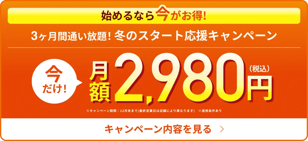 2025年11月のキャンペーンでは恒例の3ヶ月通い放題キャンペーンが開催中。